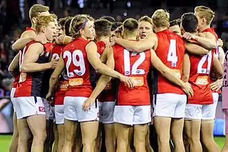 In addition to the Friday night match, the club played eleven Saturday matches (five afternoons, three twilights, and three nights), eight Sunday matches (all afternoon matches) and two Monday matches (one afternoon and one night).[12] Nine matches were broadcast on free-to-air on the Seven Network and thirteen were broadcast on pay TV on Fox Footy.[12] The teams the club played twice were Adelaide, Carlton, Collingwood, North Melbourne and St Kilda, with Adelaide and North Melbourne the only teams finishing in the top eight in 2016.[8] With the off-season recruitment of Hawthorn player, Jordan Lewis, both AFL Media and the Herald Sun noted the round seven match against Hawthorn as the "match to watch" for Melbourne's season.[16][17] Analysis by Champion Data ranked the fixture difficulty as the eighth hardest out of the eighteen teams.[18]