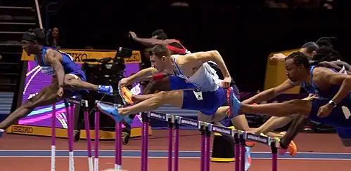 After setting his national record as the #2 qualifier in the semi-finals, Milan Trajkovic false started himself out of the finals. Pozzi was the first over the first hurdle, but only inches ahead of Jarret Eaton. Between hurdles, Eaton exploded to almost a foot (30 cm) advantage over the next hurdle, about the same advantage Pozzi held over Martinot-Lagarde. Both Pozzi and Martinot-Lagarde rattled the second hurdle, though Martinot-Lagarde lost more ground being knocked off balance. Eaton extended his lead, doubling it over the third hurdle, which he rattled. Martinot-Lagarde slammed the third hurdle and was out of contention, replaced by his teammate Aurel Manga and Merritt another two feet behind Pozzi. Going over the fourth hurdle, Merritt looked to have a slight advantage over Manga but by the final barrier Manga had the advantage. Eaton slammed the final hurdle, losing some of his momentum, Pozzi caught him before the finish. Manga clearly beat Merritt to the line for bronze.
