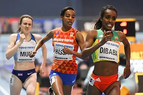 The final saw the return of several lead combatants from the 3000 metres two days earlier. Their strategies changed here. At the gun, world record holder Genzebe Dibaba started more aggressively, showing her intent to mark the leader, who turned out to be Beatrice Chepkoech. Returning champion, Sifan Hassan went to her familiar position at the back of the pack. After a lap of easy jogging, Rababe Arafi moved out to a faster pace, immediately marked by Dibaba. The additional speed quickly brought Hassan into a marking position on Chepkoech behind Dibaba, then Laura Muir squeezed through the inside to run behind Dibaba. After another lap, Dibaba tired of the gamesmanship and took the lead. Hassan, Muir, Chepkoech, Arafi and Winny Chebet formed a chase pack that separated from the rest of the field. Over two faster laps, Chepkoech moved past Hassan to mark Dibaba as the three broke away from the other three, with Muir looking like she was struggling to hold on to the back of the second group. But with three laps to go, Muir sprinted around the group and quickly bridged the gap back to lead group. Chepkoech struggled and fell off the back leaving a three woman breakaway, with Dibaba leading Hassan then Muir with two laps to go. The medalists were decided as the two Kenyan women faded in the rearview mirror. The positions remained the same until the final backstretch when Muir sprinted past Hassan as Dibaba pulled away. Dibaba continued to pull away to the finish, Muir separating from Hassan.