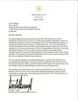 Trump canceled the summit on May 24, 2018, via a letter to Chairman Kim, writing that "based on the tremendous anger and open hostility displayed in your most recent statement, I feel it is inappropriate, at this time, to have this long-planned meeting ... You talk about your nuclear capabilities, but ours are so massive and powerful that I pray to God they will never have to be used." Even though it was Trump who decided to cancel, Trump told Kim, "If you change your mind having to do with this most important summit, please do not hesitate to call me or write."[63][64]
