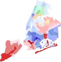 A total of 17 candidates had their petitions to get on the ballot approved by the Board of Elections.[4] Originally, only 16 candidates were approved, but an appeal by minor candidate Helal Shiekh was successful and he was placed on the ballot.[4] The large field of candidates, featuring several prominent politicians, divided the New York City Council, with few members making endorsements as they had good relations with several different candidates.[22] In December 2018, several ballot initiatives were passed in New York City that made it substantially easier for candidates to publicly finance their campaigns.[23] This development was viewed as harming Mark-Viverito's campaign, as under the old financing rules she had had a large fundraising advantage over all other candidates, due to her several high-profile campaigns for the City Council.[23] Mark-Viverito's campaign also suffered from many left-wing groups, which had previously supported her, becoming disillusioned with her as a result of her tenure as City council speaker, where she had compromised on reforming the New York Police Department and had closely collaborated with Mayor Bill de Blasio on controversial rezoning decisions.[24]