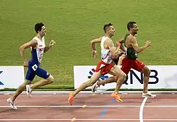 The men's 1500 metres at the 2019 World Athletics Championships was held at the Khalifa International Stadium in Doha from 3 to 6 October 2019.[1] The winning margin was 2.12 seconds which as of 2024 remains the only time the men's 1,500 metres has been won by more than two seconds at these championships (the 1991 final was won by exactly two seconds).