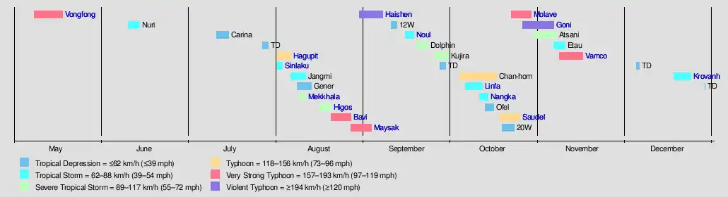 Tropical Storm Krovanh (2020)Typhoon VamcoTyphoon GoniTyphoon MolaveTyphoon SaudelTropical Storm Nangka (2020)Tropical Storm LinfaTropical Storm Noul (2020)Typhoon Haishen (2020)Typhoon Maysak (2020)Typhoon Bavi (2020)Tropical Storm Higos (2020)Tropical Storm Mekkhala (2020)Tropical Storm Sinlaku (2020)Typhoon Hagupit (2020)Typhoon Vongfong (2020)