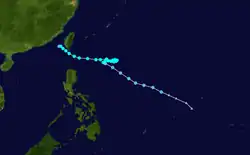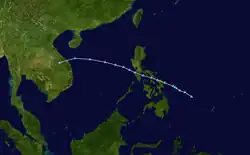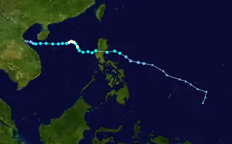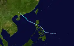 On July 29, a tropical disturbance formed and was situated a couple hundred miles east of Manila, Philippines. Struggling to consolidate, the disturbance crossed Luzon with little to no organization and began organizing in the South China Sea. Environmental conditions became conducive for development, and the JMA declared that a tropical depression had formed in the early hours of July 31.[67] Then early on August 1, the depression intensified into Tropical Storm Sinlaku.[68] The storm failed to intensify much afterward, and during the following day, Sinlaku made landfall on northern Vietnam.[69] Shortly thereafter, both agencies issued final advisories on the storm.[70][71]