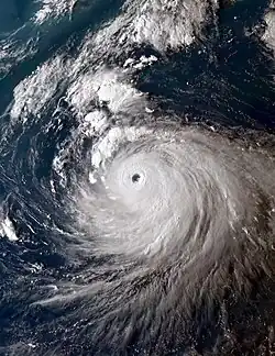 Three tropical cyclones present in the western Pacific Ocean simultaneously on October 28. From left to right: Molave, Goni, and a low-pressure area which later became Atsani (at bottom-right).