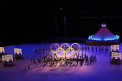 The event, which was set to last three and a half hours, started at 20:00 JST,[48] featured many sequences of the ceremony which were pre-recorded.[6] As part of the "Moving Forward" theme, many segments involved diverse representation and building or re-building.[49] The titles from this section largely come from the organisers.[50][51][52][53][54][55][56][57][58]