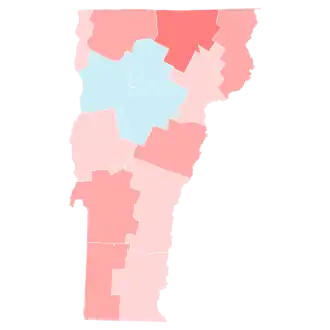 Biden easily emerged victorious in the Green Mountain State 66.09% to 30.67%, a margin of 35.4%. This is the first time Vermont was the strongest state for either party since 1956, when it was Republican Dwight D. Eisenhower's best state. Vermont also saw the largest increase in turnout from 2016, increasing 14.3%.[4] Biden greatly improved on Hillary Clinton's 55.7% vote share and 25.9% margin from 2016, when third-party candidates received over 14% of the vote; with an improvement of 9% in the margin of victory, this marked the strongest leftward shift any state experienced in 2020.[5] Biden's performance was also the fourth-strongest Democratic performance in state history, as well as the third-largest Democratic margin of victory. Trump carried only one county, sparsely populated Essex bordering New Hampshire, which had voted for the winner from 1980 to 2016. Consequently, Biden became the first president to win without the county since Jimmy Carter in 1976.