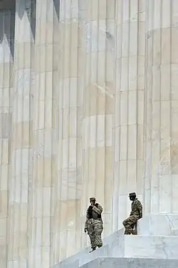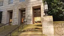 On June 26, 2020, in response to a wave of monument and memorial removals across the country during the George Floyd protests, President Donald Trump issued Executive Order 13933, Protecting American Monuments, Memorials, and Statues and Combating Recent Criminal Violence, announcing that the federal government would (1) prosecute anyone vandalizing or desecrating public monuments, memorials, and statues; government property; or religious property; (2) prosecute anyone inciting related violence; and (3) withhold federal support from local and state governments that failed to protect such structures from vandalism.[25] The executive order also stated that if the Secretary of the Interior, the Secretary of Homeland Security, or the Administrator of General Services requested federal personnel "to assist with the protection of Federal monuments, memorials, statues, or property," they shall be provided by the Department of Defense, the Department of Justice, and/or the Department of Homeland Security (DHS).[25] The order was interpreted as allowing federal officers to be deployed without the permission of individual U.S. states.[9]