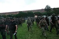 A number of law enforcement agencies were involved in the clearing operation, including personnel from the U.S. Park Police (USPP), U.S. Secret Service, Federal Bureau of Prisons, Arlington County Police Department, U.S. Marshals Service, Drug Enforcement Administration (DEA), Federal Bureau of Investigation (FBI), and Bureau of Alcohol, Tobacco, Firearms and Explosives (ATF). D.C. National Guard Military Police were present but did not participate.[31][35][36]