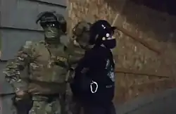 In the early hours of July 15, protester Mark Pettibone was walking home from a protest in Portland when an unmarked minivan stopped. A friend who had been walking with him recorded on videotape as multiple armed individuals clad in camouflage jumped out of the van; they apprehended Pettibone without identifying themselves or stating a reason for their actions.[58] According to Pettibone, the camouflage-clad individuals placed him in the unmarked van and blindfolded him using his own beanie hat. Pettibone says the van then drove around in the city and took him to a building that he later learned after his release was the federal courthouse.[58] There he was photographed, searched, placed in a cell, and Mirandized. Pettibone declined questioning and invoked his right to an attorney; he was released about 90 minutes later. He said he was not given any written record of his arrest or citation for any alleged crime.[58] The U.S. Marshals Service issued a statement denying their agency was involved in Pettibone's apprehension, but U.S. Customs and Border Protection later acknowledged that its agents were involved.[59]