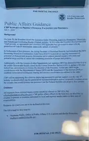 The Department of Homeland Security created the Protecting American Communities Task Force (PACT) to coordinate its response, including assessing any potential unrest and deploying personnel to protect structures.[8] Acting DHS Secretary Chad Wolf stated that the task force would not "...stand idly by while violent anarchists and rioters seek not only to vandalize and destroy the symbols of our nation, but to disrupt law and order and sow chaos in our communities."[26] PACT would partner with the Justice Department and the Department of Interior to share information.[27] Other departments that would potentially coordinate with the task force were the Federal Protective Service, U.S. Secret Service, Immigration and Customs Enforcement, Customs and Border Protection and the Transportation Security Administration.[27]