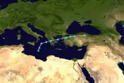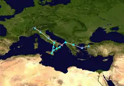 188. ^ Hellenic National Meteorological Service [@EMY_HNMS] (13 October 2021). "Έχει αρχίσει να δημιουργείται στην Κεντρική Μεσόγειο η διαταραχή που το πρωί της Πέμπτης θα επηρεάζει κυρίως τα δυτικά και τα βόρεια, ενώ το βράδυ θα επεκταθεί στο μεγαλύτερο μέρος της χώρας @GSCP_GR #ballos #warning #κακοκαιρία (The disturbance has begun to form in the Central Mediterranean, which on Thursday morning will mainly affect the west and the north, while at night it will spread to most of the country.@GSCP_GR#ballos#warning#κακοκαιρία)" (Tweet) (in Greek). Retrieved 7 November 2021 – via Twitter.