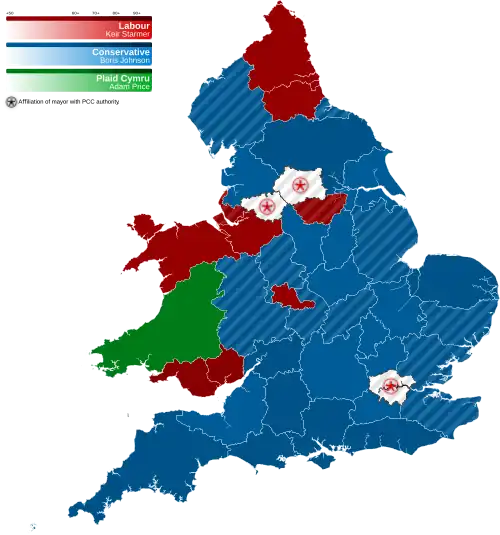 Elections of police and crime commissioners in England and Wales were held on 6 May 2021, on the same day as the Senedd election in Wales and the local elections in England.[1] This was the third time police and crime commissioner elections have been held (the two previous occasions were in 2012 and 2016). The elections were originally due to take place in May 2020 but were postponed by 12 months in view of the COVID-19 pandemic.[2] Turnout was an average of 34.1% across the elections, with Wales having much higher turnout reportedly due to the simultaneous Senedd election held across Wales, whereas only parts of England had simultaneous local elections.[3]