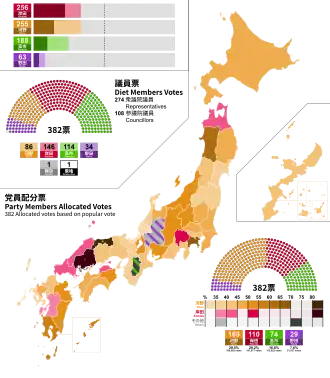 | Fumio Kishida 当 | 146 | 38.42% | 219,338 | 28.86% | 110 | 28.80% | 256 | 33.60% | 249 | 65.53% | 8 | 17.02% | 257 | 60.19% | |||