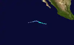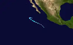 On July 26, the NHC noted a disturbance located about 700 miles (1,125 km) south-southwest of the southern tip of Baja California. The system moved parallel to another disturbance which later became Hurricane Hilda.[50] By 21:00 UTC on July 30, the disturbance attained a well-defined center of circulation with sufficient organized convection and was classified as a tropical depression, bearing the designation Nine-E.[51] The depression was initially forecast to become a tropical storm, but failed to do so due to dry air and wind shear caused by nearby Hurricane Hilda. Early on August 1, the system degenerated into a remnant low.[52] Even though Nine-E was a tropical low, the NHC still monitored the system for further development[53] On August 4, it re-intensified into a tropical depression again while maintaining two rainbands in a slightly elongated circulation.[54] On the next day, at 09:00 UTC, the depression intensified into a tropical storm, with the NHC naming it as Jimena, as the storm's deep convection had increased near the low-level center and based on satellite imagery, the storm was producing tropical storm force winds.[55] The convection later diminished on August 6, as it moved over cooler sea-surface temperatures and encountering high wind shear and dry airmass. However, despite all this, Jimena managed its intensity, as it continued to produce tropical storm force winds, based on ASCAT data.[56] A deep convective mass also continued to persist over the center of Jimena.[57] At 21:00 UTC, the NHC issued its last advisory, downgrading the system to a tropical depression as it entered the CPHC's area of responsibility. Its deep convection weakened significantly as it moved over cool sea surface temperatures causing Jimena to weaken.[58] The CPHC later issued its only bulletin for Jimena at 03:00 UTC the next day, stating that Jimena had become a post-tropical cyclone as its deep convection had collapsed completely.[59]