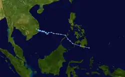 On June 10, the JTWC started to monitor an area of low-pressure in the South China Sea, approximately 518 km (322 mi) to the south of Hong Kong, with the agency classifying the system as a monsoon depression.[85] Tracking west-northwestward, the storm was located in a favorable environment for further development, with warm sea surface temperatures and low wind shear.[86] At 00:00 UTC on June 11, the JMA upgraded the system into a tropical depression.[87] Six hours later, the JTWC issued a TCFA for the system as it began to show characteristics of a monsoon depression.[88] By 18:00 UTC, the JMA upgraded the system to a tropical storm, assigning it the name Koguma.[87] On June 12 at 00:00 UTC, the JTWC upgraded Koguma to a tropical depression, assigning it the designation 05W.[89] Later that day, the JTWC also upgraded Koguma to a tropical storm.[89] By June 12, it had made landfall southeast of Hanoi,[90] and dissipated the next day.[87]