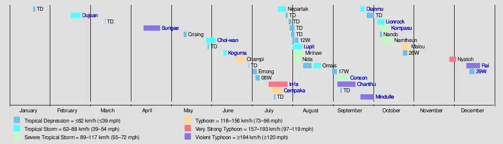 2021–2022 Malaysian floodsTyphoon RaiTropical Storm Kompasu (2021)Tropical Storm Lionrock (2021)Tropical Storm Dianmu (2021)Typhoon Mindulle (2021)Typhoon Chanthu (2021)Tropical Storm Conson (2021)Tropical Storm Lupit (2021)Typhoon CempakaTyphoon In-faTropical Storm KogumaTropical Storm Choi-wan (2021)Typhoon SurigaeTropical Storm Dujuan (2021)