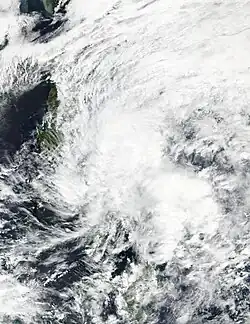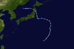 On May 27, the JMA and the JTWC noted the persistence of an area of atmospheric convection about 425 nautical miles (787 km; 489 mi) south-southeast of Guam.[57] The area's nearby environment exhibited low wind shear and warm sea surface temperatures, which were ideal conditions for tropical cyclogenesis.[58] The JMA assessed the area to have developed into a tropical depression on May 29 at 06:00 UTC.[59] The PAGASA made a similar assessment in a Tropical Cyclone Advisory issued at 15:00 UTC.[60] The JTWC later followed with their own assessment, identifying the center of the newly developed tropical depression and assigning the designation 04W.[61] As the system tracked westward, it entered the Philippine Area of Responsibility at 01:00 PHT (17:00 UTC).[62] The PAGASA then named the storm Dante in its first Tropical Cyclone Bulletin for the storm.[63] Dante further organized in the Philippine Sea,[64] and on May 30 at 15:00 UTC, the JTWC upgraded it to a tropical storm,[65] with the PAGASA doing the same at 21:00 UTC.[66] On the next day at 00:00 UTC, the JMA also upgraded Dante into a tropical storm, giving it the international name Choi-wan.[67] Choi-wan's center was exposed due to a tropical upper tropospheric trough from the northeast, inducing shear on the system.[68] On June 1 at 12:30 UTC, Choi-wan made landfall on Sulat, Eastern Samar as a minimal tropical storm,[69] with the JTWC downgrading it to a tropical depression at 15:00 UTC.[70] It made a second landfall on Cataingan at 17:00 UTC.[71] Choi-wan made several more landfalls on the Philippines, making its third landfall on Balud, Masbate at 19:30 UTC. It made a fourth landfall on Romblon, Romblon on June 2 at 00:00 UTC, a fifth on San Agustin, Romblon at 00:50 UTC, a sixth on Pola, Oriental Mindoro at 06:00 UTC, a seventh on Tingloy, Batangas at 11:20 UTC, and an eighth and final landfall on the Calatagan Peninsula before moving into the South China Sea.[72] On June 3 at 03:00 UTC, the JTWC upgraded Choi-wan back to a tropical storm.[73] At 03:00 UTC, the PAGASA removed all Tropical Cyclone Warning Signals as Choi-wan moved away from the country.[74] Choi-wan then exited the PAR on June 3 at 18:00 UTC[75] before weakening into a tropical depression on the next day at 06:00 UTC and re-entering the PAR at 08:00 UTC.[76] Then, it passed southeast of the island of Taiwan[77] before moving out near the Okinawa Prefecture and heading towards Japan. On June 5 at 06:00 UTC, the Japan Meteorological Agency issued their final advisory on the system.[78] 3 hours later at 09:00 UTC, the JTWC upgraded Choi-wan back into a tropical storm,[79] however at 15:00 UTC, the Joint Typhoon Warning Center downgraded the system to a tropical depression, also issuing their final advisory on the system.[80]