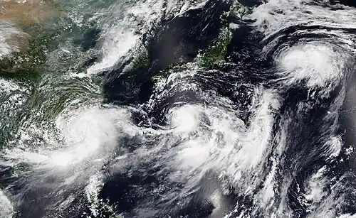 Three simultaneous tropical cyclones on August 6, Tropical Storms Lupit (left), Mirinae (center), and Nida (right)