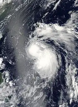 On May 11, the JTWC noted a persistent area of convection in the Philippine Sea, approximately 184 nmi (341 km) west of Palau.[41] The JTWC issued a TCFA for the convection on May 12, as it further developed in an environment with low vertical wind shear and warm sea surface temperatures.[42] Just three hours later, the agency recognized that the area of convection had quickly consolidated into a tropical depression and assigned it with the identifier of 03W.[43] Around the same time, the JMA had also recognized the storm as a tropical depression while it was to the east of Mindanao.[44] Since the storm developed within the Philippine Area of Responsibility, the PAGASA immediately named the storm Crising once the agency recognized it as a tropical depression as well, and later raised Signal No. 2 warnings for areas in Mindanao.[45][46] In the early hours of May 13, the JTWC upgraded the system into a tropical storm, with the PAGASA following suit hours later.[47][48] Later that day, Crising's low-level circulation center became exposed due to wind shear, and it lost organization. At 8:20 p.m. Philippine Standard Time (12:20 UTC), Crising made landfall in Baganga, Davao Oriental as a weakening tropical storm. It quickly degraded as soon as it made landfall, with both the JTWC and the PAGASA downgrading it to a tropical depression at 15:00 UTC.[49][50] At 03:00 UTC on that day, the PAGASA reported that the system degenerated to an area of low-pressure in the vicinity of Piagapo in Lanao del Sur, thus lifting all warning signals on Mindanao and issuing their final advisory.[51] On May 14, the system dissipated over the Sulu Sea, and both the JMA and the JTWC issued their final advisories on the storm.