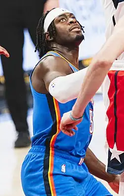 On March 2, the Thunder announced Kenrich Williams will miss the rest of the season after sustaining a scapholunate ligament rupture in his left wrist after a 123–117 loss to the Sacramento Kings. In his third season with the Thunder, Williams appeared in 53 games averaging 8.0 points on 51.7% from the field, 4.9 rebounds and 2.0 assists in 22.8 minutes. Williams also led the league during that time with 26 charges drawn.[103] After Lindy Waters III's two-way contract was converted into a standard contract, the Thunder signed Jared Butler to a two-way contract. Butler spent the beginning of the season with the Grand Rapids Gold in the NBA G League averaging 18.0 points and 5.7 assists in 41 games after being waived by the Utah Jazz prior to the season.[104] Against the Utah Jazz, the Thunder had their eighth game this season with three players scoring more than 20 points. Coming back from injury, Shai Gilgeous-Alexander scored 38 points, Jalen Williams had a career high 32 points on 12-15 shooting, and Josh Giddey had 24 points, 9 rebounds, and 9 assists in a 129–119 win.[105] Against the Golden State Warriors on March 7, the Thunder snapped their eight-game losing streak to Golden State.[106] Seven Thunder players scored in double-figures led by Shai Gilgeous-Alexander's 33 points. Additionally, Josh Giddey recorded his seventh career triple-double with 17 points, 11 rebounds and a career high 17 assists and Jaylin Williams scored a career high 15 points.[107] On March 19, the Thunder came back down 15 against the Phoenix Suns to win 124–120. After not playing the entire game, Aaron Wiggins lead an 18–2 run in the fourth quarter with 7 points and 2 steals while playing the whole quarter. Gilgeous-Alexander led the Thunder with 40 points while Luguentz Dort had 11 of his 20 points in the third quarter.[108] In the first of a back-to-back against the Los Angeles Clippers, Luguentz Dort defended Kawhi Leonard on the final possession and kept Leonard from getting a shot off before the clock expired to give the Thunder a 101–100 win.[109] After losing in the second game of a back-to-back with the Clippers, the Thunder fell to the Los Angeles Lakers despite Josh Giddey's 27 points, 17 rebounds, and 7 assist performance in a 116–111 loss dropping the Thunder for 10th in the West after climbing up to 7th.[110] Without Gilgeous-Alexander, Isaiah Joe, Jalen Williams, and Josh Giddey combined for 95 points in a 137–134 loss to the Charlotte Hornets. Joe, who started for Gilgeous-Alexander, had career-high 33 points with 6 threes. Williams was one point shy of his career-high had 31 points and 4 steals. Giddey finished with a career-high 31 points, 10 rebounds, and 9 assists however he missed a game-tying free throw with 4.0 seconds left.[111]