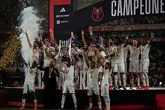 The month began on a sour note on 2 May, when Real was beaten 0–2 by Real Sociedad at the Anoeta and dropped down to third place in the La Liga standings.[68] But, fortunes improved four days later, when a brace from Rodrygo helped Madrid to triumph 2–1 over Osasuna in the Copa del Rey final at the Estadio La Cartuja in Seville for their first La Copa in 9 years, and Ancelotti's second with the club.[69] On 9 May, Madrid hosted Manchester City in the Champions League semi-finals first leg, rematching the last season's encounter at the same stage of the competition. The match ended in a 1–1 draw, as Vinícius scored a wondergoal from outside the box.[70] Four days later, an Asensio goal secured three points against Getafe.[71] On 17 May, the return leg of the Champions League semi-final against Manchester City was played and Real were beaten by a scoreline of 0–4, knocking them out of the competition.[72] Four days later, Madrid lost an away game versus Valencia 0–1.[73] On 24 May, Ancelotti's team managed to beat Rayo Vallecano 2–1 at home, as Benzema and Rodrygo got on the scoresheet.[74] A Rodrygo brace secured Madrid three points in a 2–1 win at Sevilla on 27 May.[75]