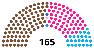 The 165 members of the National Assembly are elected by two methods; 112 are elected by either first-past-the-post or party bloc vote in single- or multi-member constituencies based on the 46 departments, with an additional 15 elected by overseas voters.[2] The other 53 seats are elected from a nationwide constituency by proportional representation, with seats allocated initially using the simple quotient, with remaining seats allocated using the largest remainder method.[3]