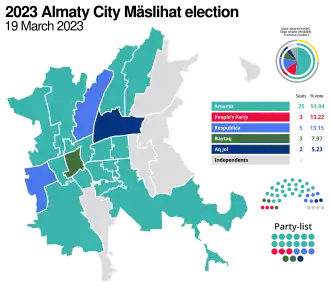 Elections to the Almaty City Mäslihat were held on 19 March 2023 to elect 42 deputies to the 8th convocation of the Almaty City Mäslihat. It coincided with the 2023 local elections. For the first time, a mixed electoral system was used, with half of the seats filled through single-member districts and the other half through party-list proportional representation.