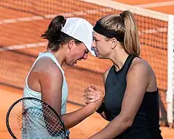 In May, Świątek entered the Italian Open as the defending champion. In the second round, she doubled-bageled Anastasia Pavlyuchenkova before defeating Lesia Tsurenko and Donna Vekić in the following rounds. In the quarterfinals, she faced Elena Rybakina and was forced to retire in the third set after sustaining a right thigh injury.[20] At the French Open, Świątek reached her fourth major final without dropping a set. She won her third French Open and fourth major title overall, defeating Karolína Muchová in three sets in the final.[21][22] She also became the first woman to defend the title since Justine Henin in 2007.[23]