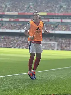 On 27 August, Arsenal announced that 28-year-old Spanish midfielder and Euro 2024 winner Mikel Merino had joined the club from La Liga side Real Sociedad on a long-term contract.[41] The transfer fee was reported to be an initial £27.4 million (€32.5 million), with a further £4.2 million (€5 million) in add-ons.[42] He would take the number 23 shirt,[41] and would be the sixteenth Spaniard to play for Arsenal's first team.[43]