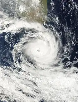On 12 December, the JTWC upgraded the system to a Category 4-equivalent tropical cyclone, with estimated 1-minute maximum sustained winds of 250 km/h (155 mph),[45] while the MFR estimated its peak intensity with a minimum central pressure of 935 hPa (27.61 inHg) and 10-minute maximum sustained winds of 215 km/h (130 mph) as it maintained its small size and moved westwards.[46] After reaching its peak intensity, the cyclone's eye, which was 13.8 miles (22.2 km) wide, became cloud-filled and increasingly ragged, and on 13 December, an eyewall replacement cycle occurred, causing the storm to weaken.[47][48] Chido entered the Mozambique Channel on 14 December, with microwave imagery showing highly developed organized bands of deep convection.[49] As it neared Mayotte, it quickly re-intensified, with Pamandzi Airport recording a maximum gust of 226 km/h (140 mph), setting an all-time record for the station, and a minimum pressure of 982 hPa (29.00 inHg),[50] breaking the previous record of 985 hPa (29.09 inHg) set during Cyclone Kamisy in 1984. Additionally, the MFR reported that it was the strongest storm to strike Mayotte in at least 90 years.[51] Chido made landfall on Pemba in Mozambique, with 10-minute sustained winds estimated at 205 km/h (125 mph).[52] Shortly after landfall, the JTWC discontinued warnings,[53] and the MFR reported that Chido moved through Mozambique and Malawi, with convective activity gradually weakening.[54] On 16 December, Chido degenerated into an overland depression, and the MFR issued its final advisory on the system.[55]