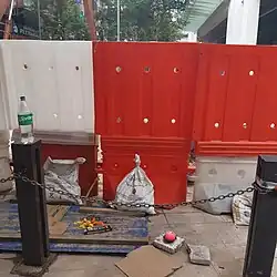 Flowers and a burning candle left at the perimeter of the sinkhole exclusion zone in memory of Vijayalakshmi Gali