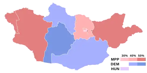 30. ^ Adiya, Amar (2024-06-28). "Mongolia Election 2024: MPP Wins Third Term, But Majority Reduced". Mongolia Weekly. Retrieved 2024-07-05.