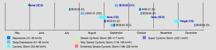 The official Regional Specialized Meteorological Centre in this basin is the India Meteorological Department (IMD), while the Joint Typhoon Warning Center (JTWC) releases unofficial advisories. On average, four to five cyclonic storms form in this basin every season.[2]