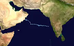 Early on 9 October, a low-pressure area formed near Lakshadweep, becoming a well-marked low-pressure area the following day. At 12:00 UTC on 13 October, the disturbance organised into a depression as it tracked over the central Arabian Sea. The depression moved northwestward, making landfall near Duqm, Oman late on 15 October. It then disorganised inland, weakening into a well-marked low-pressure area over coastal Oman by 18:00 UTC that day.[52]