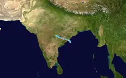 On 14 October, a well marked low pressure area formed in the south of the Bay of Bengal. The IMD upgraded it to a depression, designating it as BOB 06, early on 15 October as it moved west-northwestwards before making landfall in Andhra Pradesh on 17 October at 04:30 IST. It weakened further into a low pressure area as it moved north-westwards into India and dissipated.[53]