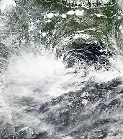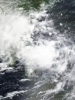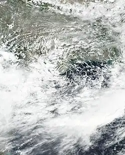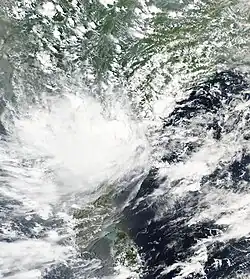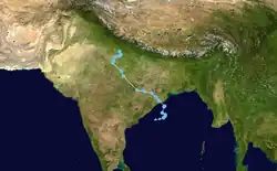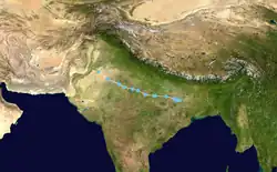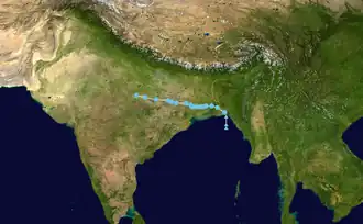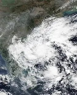 The India Meteorological Department (IMD) to tracked a cyclonic circulation over Myanmar on 11 September.[38][39]This disturbance would coalesce into a low-pressure area the next day,[40] further developing into a well-marked low-pressure just a few hours later.[41] Soon after, it developed into a depression.[42] Early the next morning, it became a deep depression over Bangladesh and West Bengal.[43] On 15 September, it weakened back down to a depression as it slowly moved westward over western India.