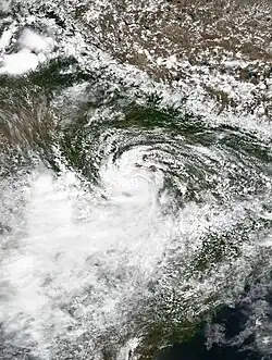 On 24 August, a cyclonic circulation formed over Madhya and Uttar Pradesh. Early the next day, on 25 August, the IMD noted that it had developed into a land depression over Rajasthan and Madhya Pradesh.[20] Later that day, the depression intensified into a deep depression southeast of Udaipur.[21] On 27 August, the JTWC began tracking the deep depression, noting that it was in a marginal environment for development.[22] Two days later, on 29 August, they issued a TCFA on the developing depression,[23] prior to designating it as Tropical Cyclone 02A early the next day.[24] Later that same day, on 30 August, the IMD upgraded it into a cyclonic storm, naming it Asna.[a][26][27] It further moved into the Arabian Sea.[28] On 1 September, Asna was stripped of any convection due to dry air entrainment and degenerated to a remnant low.[29]