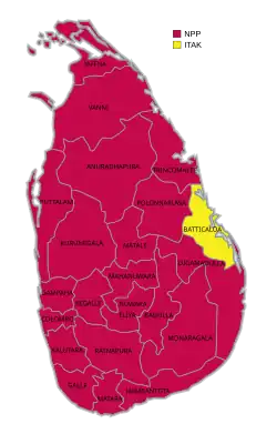 The result of the election was a landslide victory for the left-wing National People's Power coalition led by recently elected president Anura Kumara Dissanayake.[8] The NPP won 159 seats, more than any Sri Lankan political party in history, the second highest proportion of seats in the nation's history, and won every district except Batticaloa. This was the first election since 1977 where a single party managed to achieve a supermajority and the first time the Jaffna District was won by a non-Tamil political party.[9] This election also saw a record in women's representation with 21 female MPs elected, the highest in Sri Lanka's parliamentary history,[10] and a record number of more than 150 MPs are first-timers.[11]