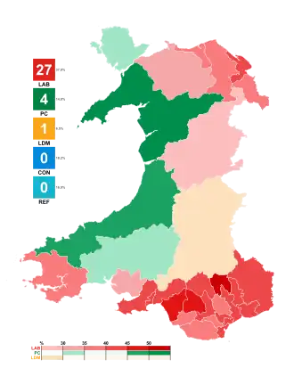 The Labour Party remained the largest party in Wales, winning 27 of the 32 seats. In addition to defending all of their seats in the south including around Cardiff and Swansea, Labour reversed many of the Conservative gains in 2019, gaining seats such as Bangor Aberconwy, Clwyd East, Clwyd North, Monmouthshire and Wrexham. Labour also won in Montgomeryshire and Glyndŵr, which covers Montgomeryshire, the only area in Wales which had, until 2024, never elected a Labour MP.[25] Of the Labour MPs elected, 2 of them are also members of the Co-operative Party. They are designated as Labour-Co-op, but generally just counted in Labour's total.