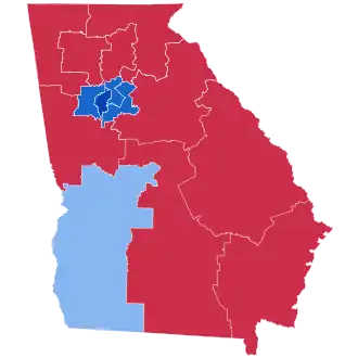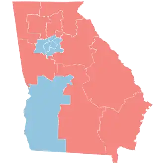 The partisan split of the map remains the same with 9 seats leaning toward the Republican Party and 5 seats leaning toward the Democratic Party. The changes affected the Metro Atlanta area with an additional black-majority district added (the 6th) in Western Atlanta; including parts of the city of Atlanta , Southern and Western Fulton County and most of Douglas County , including Douglasville which are majority-black as well as a small portion of Fayette County and southern Cobb County which are majority-minority. The 4th district retains most of DeKalb County however extends into a portion majority-minority Gwinnett County instead of Rockdale County and Newton County . The 13th district maintains most of the parts of Clayton County (exchanging a small sliver for DeKalb County ) and maintains its portion in Henry County, but also includes Rockdale County and Newton County formerly in the 4th district, and extends into southern Gwinnett County. This maintains three majority-black districts that also now reflect the community of interest in Western and Southern Atlanta. The former 7th district, which was a majority-minority district where no single ethnic group was dominant, consisted mostly of Gwinnett County as well as John's Creek ; it was disbanded as other districts took its portions. The 7th district became what was formerly the 6th district and remained mostly unchanged however it now lost its territory in Cobb and Gwinnett Counties in exchange for nearly all of North Fulton (a distinct COI closely corresponding with the former Milton County ) as well as portions of Hall County and Lumpkin County in North Georgia; which the 9th district lost in exchange for more of Gwinnett County. Additionally, the 10th district gained Eastern Gwinnett County in exchange for counties in Northern Georgia also from the 9th. Finally, the 11th district now contains Northeastern Cobb County as well as Gordon County and the 14th district now contains Northwestern Cobb County and lost Gordon County.
