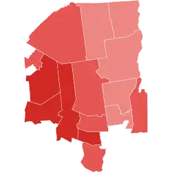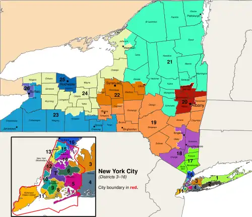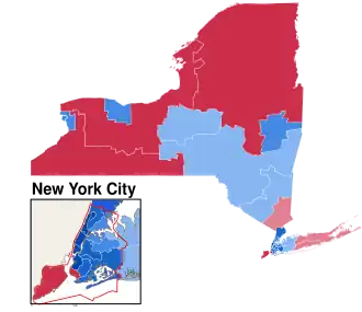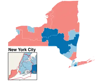 In the 2022 House election in New York, under the new map, the Republican Party flipped 3 seats, bringing the new seat count of 15 for the Democrats and 11 held by Republicans.[2] In March 2023, New York Democrats challenged the new map, deeming it incorrect for the Court to draw the map, claiming that the job lies solely with the Legislature and I.R.C.[3] In July 2023, an intermediate appeals court ruled that the I.R.C. must create another new map for the 2024 House Elections.[4] The New York State Republicans challenged the ruling to the Court of Appeals, who ruled on December 12, 2023, that the maps must be redrawn by the legislature and I.R.C. for the 2024 elections.[5][6] On February 27, 2024, the New York State Legislature voted to reject the bipartisan map and instead favored redrawing the map for Democrats. On February 28, 2024, the state legislature passed a new map, resulting in the 3rd, 18th, and 22nd congressional districts becoming more Democratic, while the 1st became more Republican.[7] The map was signed by Governor Kathy Hochul on the same day.