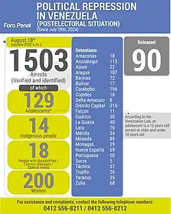 Venezuelan human rights organization Foro Penal reported on 18 August they had been able to verify 1,503 arrests, including 129 adolescents, during the post-electoral period beginning the day after the elections.[105][103] By 26 August, it reported that—including political detainees from the pre-electoral period—Venezuela had reached the highest number of political prisoners during the 21st century, at 1,674.[108] On 2 September, they reported that Venezuela had 1,793 political prisoners, of which 1,659, including children, were detained after the election; most have not been sentenced, but are charged with terrorism.[109][110]