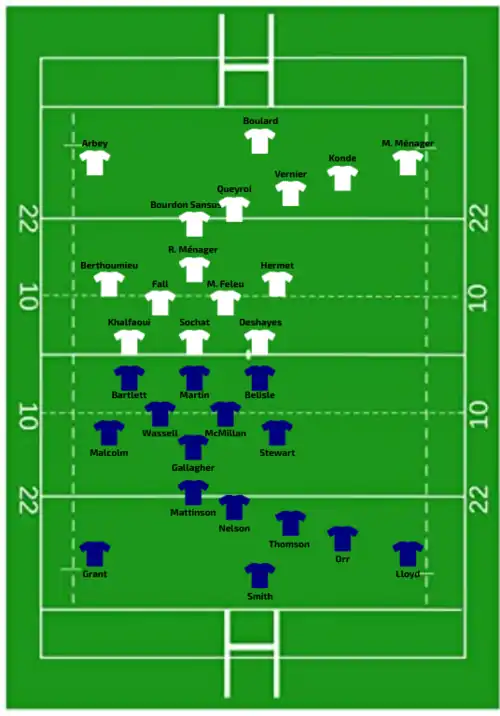 | Try: Sansus 3' c M. Ménager 32' c Fall Raclot 47' c Sochat 62' c Riffonneau 75' c Con: Queyroi (4/4) 4', 34', 49', 63' Bourgeois (1/1) 77' Pen: Queyroi (1/1) 38' | Report | Try: Wafer 71' c Dalton 78' c Con: O'Brien (2/2) 72', 77' Pen: Fowley (1/1) 14' |