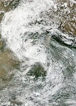Under the influence of the tropical disturbance, a low pressure area formed over the eastern Arabian Sea off the southern Konkan-Goa coasts by 05:30 IST on 22 May.[3] By 05:30 IST on 23 May, it became a well marked low pressure area off the southern Konkan coast and persisted over the same region as of 08:30 IST.[4] The system organised into a depression by 05:30 IST on 24 May about 40 km northwest of Ratnagiri.[5] Over the next 6 hours, the depression moved slowly eastward at a speed of 5 km/h and between 11:30 and 12:30 IST it made landfall, crossing the south Konkan coast near Ratnagiri. The maximum sustained windspeed at the time was 25 knots (46 km/h) gusting to 35 knots (65 km/h).[6] The system then moved eastwards inland and[7] by 05:30 IST on 25 May, the system had weakened back into a well marked low pressure area over southern Madhya Maharastra and the adjoining regions of Marathwada and Karnataka.[8]