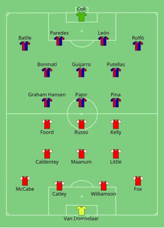 In the 9th minute, Barcelona forward Clàudia Pina went down after a challenge from Chloe Kelly. Pina complained to the referee and asked for a booking to be given to Kelly, however the referee decided that one was not deserved. One minute later, Barcelona had many chances to score in Arsenal's box but did not succeed. Aitana Bonmatí took a shot into Arsenal's net in the 12th minute, but was blocked by Kelly. In the 17th minute, Barcelona got a corner kick and Mapi León took it, they failed to score. In the 22nd minute, Irene Paredes of Barcelona scored an own goal, however it was ruled out by VAR due to an offside in the buildup to the goal. Midway through the first half, Barcelona started adding pressure to Arsenal's defenders. Another corner was then given to Barcelona in the 39th minute, but no goal occurred. A shot was taken by Pina in the 47th minute but it was saved by Daphne van Domselaar. She shot again two minutes later, but the ball bounced off the crossbar. Paredes was given a yellow card in the 50th minute for a slide against Caitlin Foord. Barcelona made a substitution in the 61st, Pina being removed and replaced by Salma Paralluelo. Frida Maanum of Arsenal was injured in the 67th minute and this led to Arsenal doing two substitutions, Stina Blackstenius for Manuum, and Beth Mead for Kelly. In the 74th minute, Mead passes to Blackstenius who scored the first goal of the game for Arsenal. The possibility of Blackstenius being offside was brought up, but it was shown to be untrue. Barcelona made a double substitution in the 80th minute, Ingrid Syrstad Engen and Esmee Brugts come on for León and Fridolina Rolfö, respectively. Bonmatí shot in the 84th minute, but it was blocked by Leah Williamson. Arsenal made a substitution in the 86th minute, with Lina Hurtig replacing Foord. In the 88th minute, Paralluelo was given a yellow card for hitting Mead's face. Three minutes later, Alessia Russo was taken off for Lotte Wubben-Moy. Barcelona took two shots before the game ended, but both failed to go in.[14] Arsenal won the match 1-0 to win the final, while Blackstenius was given the Player of the Match award.[1]