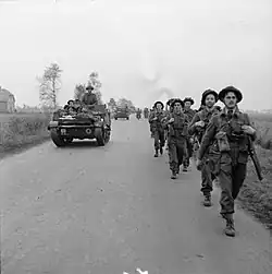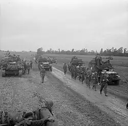 In the early part of July 1944, 15th (Scottish) took part in the fighting round Caen,[31] then at the end of the month it moved west to the Caumont sector, where it was to join in VIII Corps's break-out southwards from the Normandy bridgehead (Operation Bluecoat). Its attack on 30 July was led by 227th Brigade advancing alongside 11th Armoured on the right and 43rd (Wessex) Division on the left. 227 Brigade was organised as a brigade group, with an additional infantry battalion, supported by 4th Tank Battalion, Grenadier Guards from 6th Guards Tank Brigade (Churchill tanks) and accompanied by flail tanks to deal with the mines sown thickly by both sides during the previous two months of stalemate. They began their advance a few minutes before 07.00. First the Highlanders had to clear two village strongpoints within a mile of Caumont and then capture les Logues and Point 226 (or Quarry Hill) a few miles further south. 'As soon as the leading troops showed themselves on the forward slopes of the Caumont ridge they ran into heavy defensive fire, and seven of the Churchills and two flail tanks were put out of action by mines'.[44] However, the surviving flails made passages, the tanks caught up with the infantry and the first objectives were taken by 10.00. While the infantry carried on mopping-up, the tanks drove on to Point 226. 43rd (Wessex) had been held up, so 6th Guards Tank Brigade took Point 306 on the left as well, and then had to hold on until 18.00 when the first infantry caught up. Now they came under heavy shelling followed by an attack from Jagdpanthers of 654 schwere Panzerjäger-Abteilung (654th Heavy Anti-Tank Battalion), which drove over Point 226. However, with the arrival of more of 227th Brigade's infantry, the position on Point 226 was consolidated, the tanks remaining all night while the infantry continued mopping up.[45][46] Over succeeding days VIII Corps advanced towards Mont Pincon, beginning the process of closing the Falaise 'Pocket'.