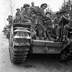 Universal Carriers and infantry of the 2nd Battalion, Argyll and Sutherland Highlanders move up for the attack on Tilburg, Netherlands, 27 October 1944.