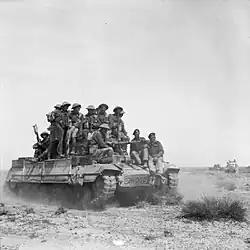 In December 1942, elements of the brigade, now with the 11th (Queen's Westminsters) Battalion, King's Royal Rifle Corps (KRRC) under command, began to move forward but it saw no combat until it entered Tunisia on 17 February 1943. In the Tunisian Campaign the brigade served as an independent armoured formation under XXX Corps, Eighth Army and fought in most of the battles of the campaign. On 3 May, the 50th RTR was withdrawn to convert to M4 Sherman tanks. After the campaign, the 46th RTR was reassigned to the brigade, although it was still converting to Shermans and the 40th RTR began to convert to the new tank.[7]