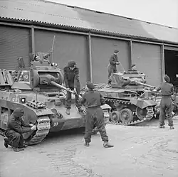 The brigade was formed as the 23rd Army Tank Brigade on the outbreak of the Second World War as a 2nd Line Territorial Army (TA) formation, under the command of Brigadier W. F. Murrogh. The brigade had only a few light armoured vehicles during its existence as an Army Tank Brigade.[3][4] It was reorganised and renamed the 23rd Armoured Brigade on 1 November 1940, when it was assigned to the new 8th Armoured Division (Major General Richard McCreery). As part of the reorganisation it was reinforced with the 1st Battalion, London Rifle Brigade, this motorised infantry battalion was renamed the 7th Battalion, Rifle Brigade (The Prince Consort's Own) on 19 January 1941.[5] It began to receive significant numbers of tanks as a consequence of its assignment to the 8th Armoured Division, deliveries of the close-support version of the Matilda II and Valentine tanks beginning about that same time. By November 1941, the brigade had approximately 18 Matildas and 120 Valentines.[6]